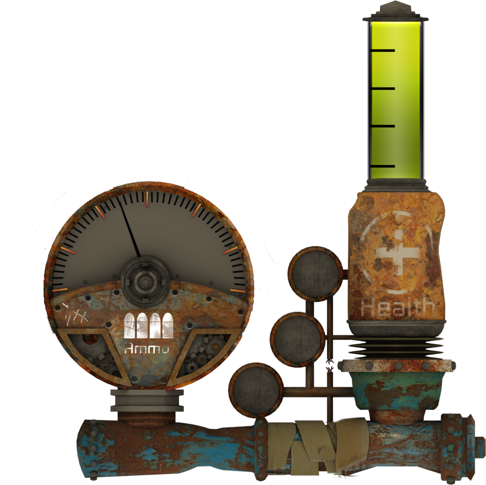 This is my first attempt at combining a 3d model with traditional 2d art to create a kind of hybrid hud. It would essentially be for any HUD that requires a numerical and visual value to represent whatever you would want it to. In this case, the gauge is for ammo and the large green bar is for health. In the end though it is almost impractical for the major genres of games (FPS, RPG’s), to design it this way due to it being hard to get specific info displayed and make it large enough for the player to read. However if this was a HUD designed say for a 2d point and click game where specific info is not needed but only the general idea then I beleive this would suit it just fine.